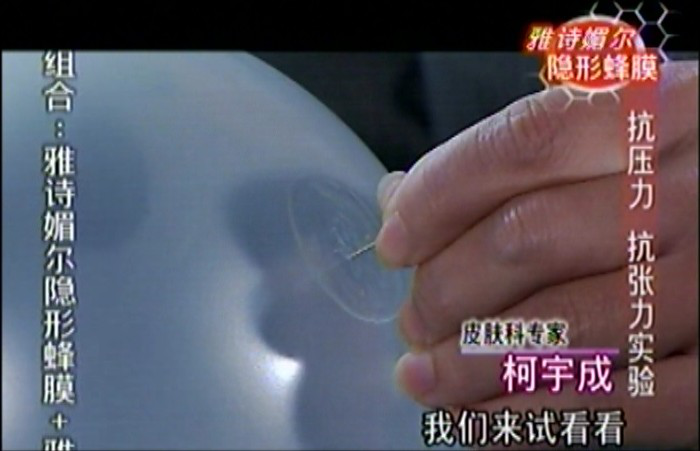将雅诗媚尔隐形蜂膜凝胶产品涂抹在气球上,等它自然风干,待形成一层透明的胶膜时,然后用钢针去扎气球,是扎不破的