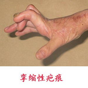 挛缩性瘢痕是以肢体或器官的功能受到影响而划分的一类瘢痕。它不仅有明显的功能障碍,也存在明显的外观改变。多见于较大面积的烧伤肉芽创面愈合后,瘢痕深而厚,范围较大。也可见于外伤较深跨越关节部位的直线瘢痕。瘢痕由于自身的收缩和增生造成关节活动受限、器官变形和移位畸形。如关节部位形成蹼状瘢痕,关节伸展受限,又如手背增生性瘢痕,既有增生,又有挛缩。