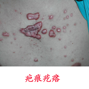 疤痕疙瘩被中医称为蟹足肿或巨痕症,是纤维瘤的一种。此病与体质有关,是由纤维结缔组织过度增生的产物,凡属疤痕体质者表皮若受到损伤,如创伤、蚊虫叮咬等就有很大可能形成疤痕疙瘩。疤痕疙瘩凸出皮肤表面呈瘤状增生,表面光滑,色红而发亮,常发现有扩张的毛细血管向外延伸。皮肤损坏至边缘向外伸出,蟹脚形变,感到奇痒或有刺痛灼热感。由于疼痛感敏锐,可能系神经末梢传导敏感或微神经瘤的形成,甚至衣服等轻轻触及即感疼痛。疤痕疙瘩好发于胸、肩、颈、背与耳廓。男女均可发生。
